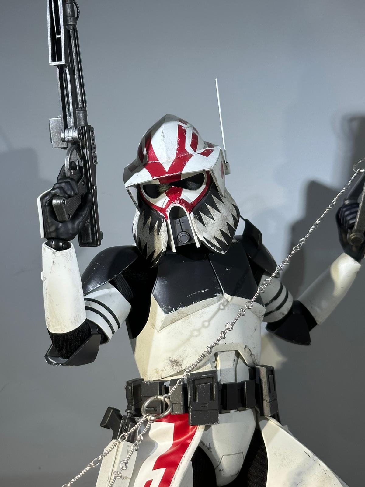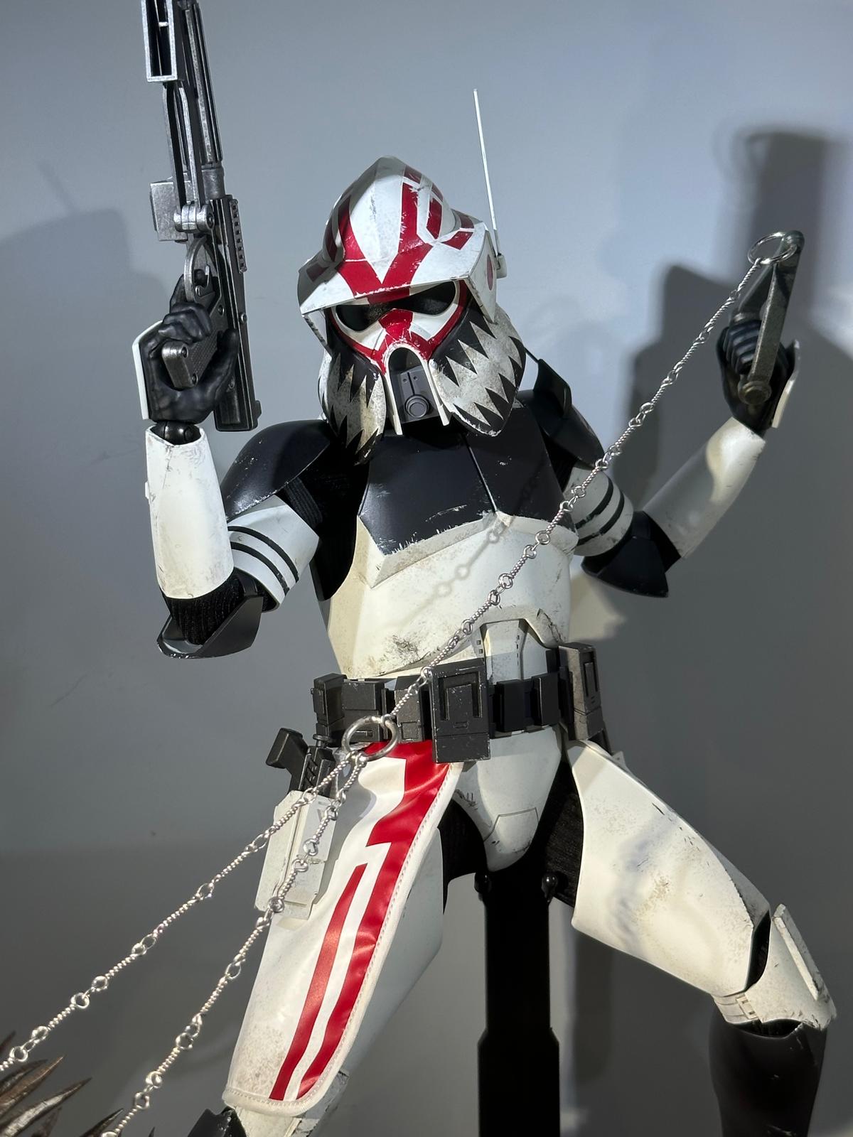 – One (1) finely crafted white and dark gray colored Sergeant Hound armor painted with red stripe details and weathering effects